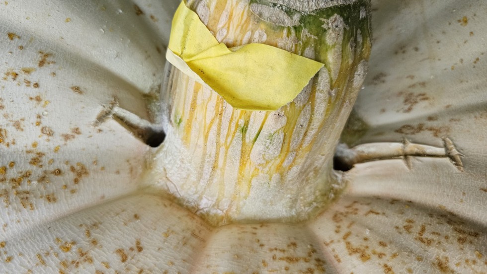 Stem split has widened a lot since the first cuts on Aug 1st. See diary. The pumpkin is still growing so we know that its ok. Air and sulphur seems to be keeping the stem very healthy.