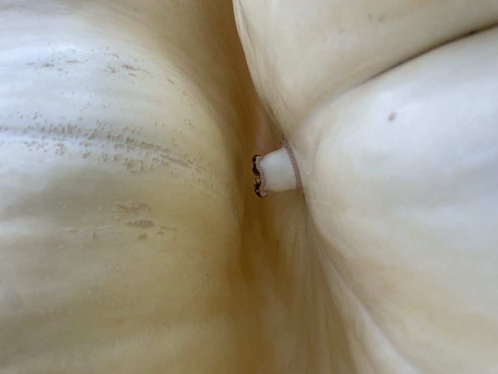 Question for growers who have faced this type of "mouth folding" pumpkin. The blossom end is getting close to touching the fold. In your experience, should I cut it or leave it alone?