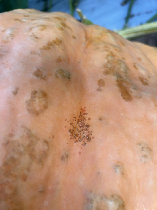 I noticed these strange spots on the pumpkin today. They appeared over the past 2 days while I had a tarp over the pumpkin. They are hard and dry and are only on the top side.