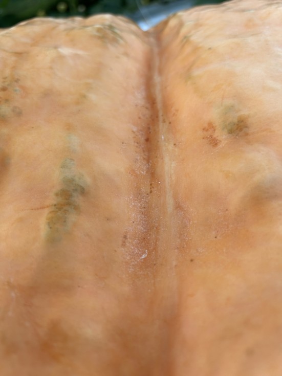 I also noticed some white powdery/fluffy stuff in patches. This kinda reminds me of what people see when they get mites but on the pumpkin instead of the leaves. Any thoughts?