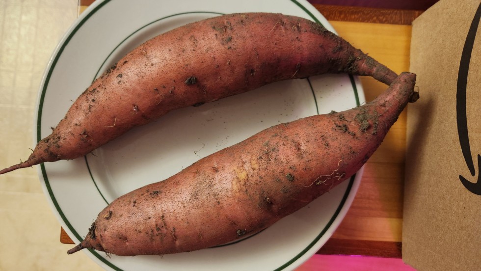 My 1st sweet potato sampling. Found a clearance bag of sweet potato seeds at Walmart on the bottom shelf. Great bargain. Time to lift these guys!!