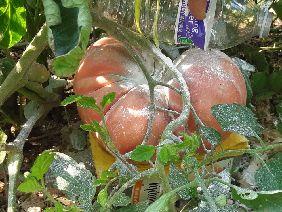Time for a tomato dustup. Well, the sulfer kind. This one gained about 3/8 of an inch since it first started to blush. 24 1/8" now. I think 24" is a nice benchmark for a decent tomato. I can probably let this one get very ripe as it has no potential issues underneath. Wish it was on a scale so I could do the Rodebaugh thing/ know when to pick it... hmm.