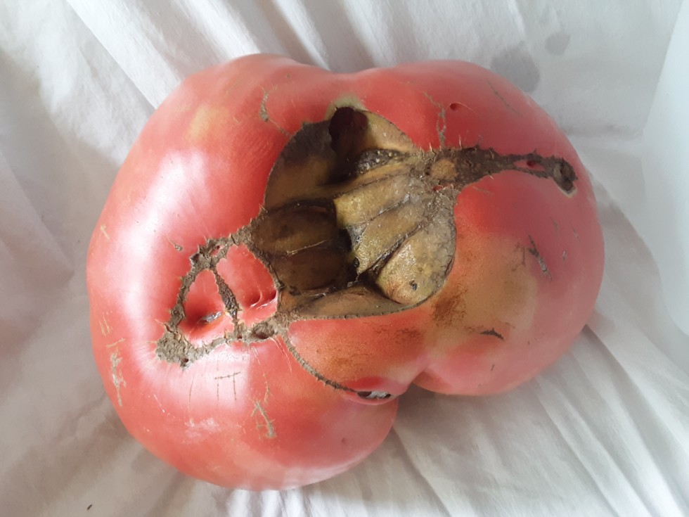 Bottom. I guess it was quite a bit catfaced. Oh well. Very solid feels heavy. The color ended up more pink than red. The others feel heavy too but let's see what this one weighs first. I already entered 3 or 4 early tomatoes. Maybe we are allowed 3... or 5? I'll have to check.