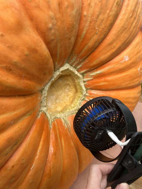 While the rot didn't go into the pumpkin, it did consume the entire stem. Im going to spray w/ peroxide 2x per day and keep a fan on it until it gets loaded up next weekend. All of this because I didn't remove the tendril. Luckily, it's a preventable problem that I can stop from happening next year.