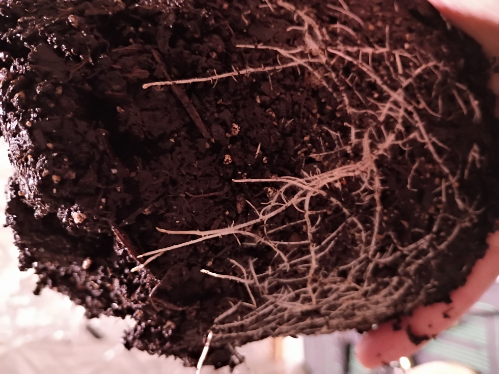 More for my own reference but roots shown here in 1 gallon pot size of soil with one week of growth since sprouting. There was about an inch and a half of bottom soil not patch worked with roots.