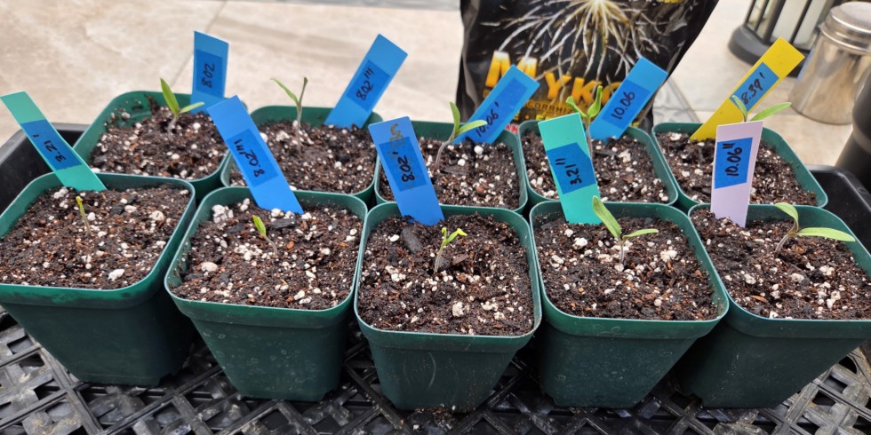 Started 13. 10 germed. Potted up yesterday and put 'em back in the grow tent. Temp set to 68 degrees with grow light on for 16 hours, off for 8. They'll live there until they're about 3-4" tall, before moving outside.