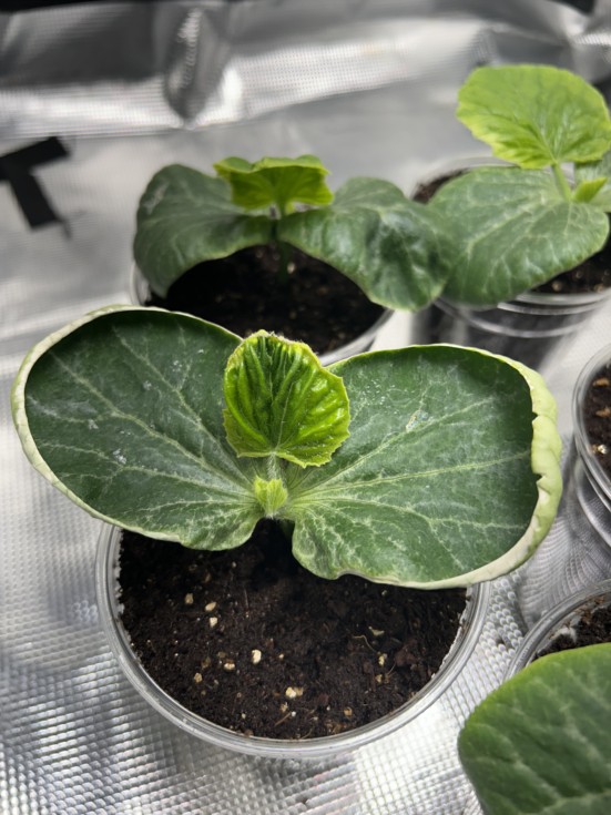 Cots w/ cupped and burnt edges and 1st true leaf w/ deep wrinkling and burnt edges. These are in 100% seed starter so there's no chance it's nutrient burn. I swear the LED light panel's I've used since 2024 are just not good for pumpkins because my seedling are either burnt to hell or leggy, and they get this yellowing/necrosis either way. I grew my seedlings in a mini greenhouse last year w/ natural sunlight and they looked great so that makes me think it's a light issue as well.