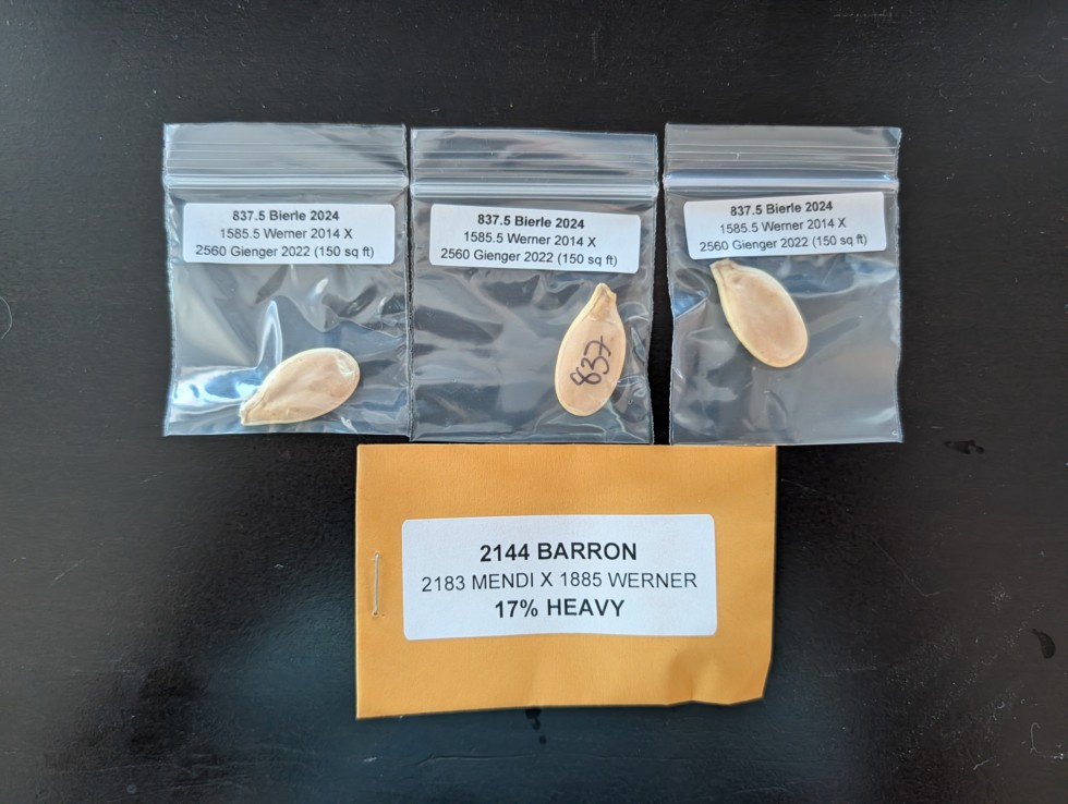 Lots of good seeds to pick from in my collection but this is what I pulled. 2144 needs no introduction. 837.5 is a cross I made a few years back pulling forward some of the first genetics to break 2K with one of the modern great. It was a bonus that the father was a beautiful orange 2560. Should be a nice looking fruit with (hopefully) strong genetics. Was a 150 sq ft plant that was quite competitive.