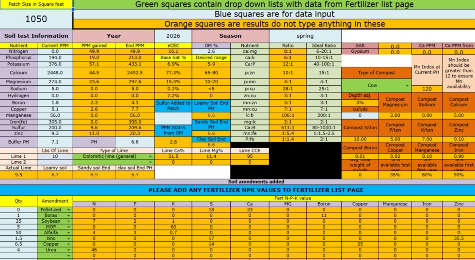 So in running the Langley calculator I am looking at adding some Potash, Dolimitic Lime, Zinc, Copper, Alfalfa Meal, Soybean Meal, Urea and Boron. I will try to get everything but the Urea out soon and the Urea when the plants come out of the hoop houses since we tend to lose nitrogen if applied too early, hopefully the SBM will provide some slow release N. I am shooting for a 10 to 1 P to Zn ratio, hopefully increasing my Zn levels will help with the potential Zn tie up from the excessivly high P. Other non nutritive additions this spring will include several bales of peat moss and some granular Humic Acid.