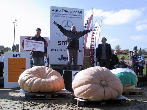 This are the winner with theyr pumpkins. The contest was held between Germany, France, Italy and Switzerland. And the Winner is 753lb Hans raising his arms in the air.