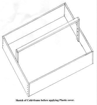 The one I use is 7 feet wide and 9 feet long. The sides are made of 2 x 10 lumber. You need 2 pieces 7 feet and 2 pieces 9 feet long. They are nailed together at the corners to form a rectangle. Next, on the center of both ends (7 foot wide) nail or screw a 2 x 4 on the inside long enough so it sticks up above the end pieces about 10 inches. These support the peak, which is a 7 foot 2 x 4. It is covered with either 4 or 6 mil clear plastic that is stapled in place and then 1 x 2�s are tacked on the top of the 4 sides to securely hold the plastic in place. These are just attached with short nails because the plastic sometimes needs to be replaced. I start my Giant type and Burpee Prizewinner seeds in this cold frame. I keep a 4-foot board at the edge of the cold frame, which is used to hold up one edge while working in the cold frame.