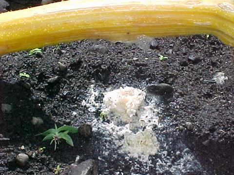 This is the main vine of my wiltting 815 plant. It is exposed in this section because there was a pumpkin set on it very close to this area. That pumpkin aborted at soccer ball size. Notice this pile of stuff under it.It is a clear liquid dripping from underside of the vine then it dries into this white powder stuff. didn't touch it .It's gross. Didn't smell anything funny. Then I touch the vine and it collapse in hand and the next picture shows inside the vine.