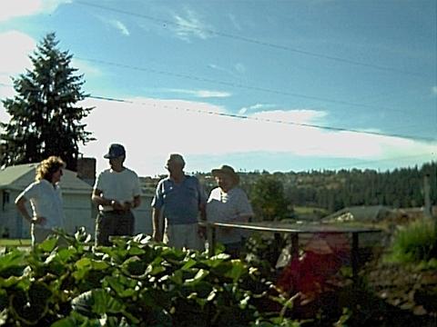 This photo showes Mr Critchfield (82 yr old, 2nd from left) detailing to my wife the proper methode of covering males, and females with cheese cloth to prevent "contamination of the pollination". The plant is his personal favorite and he asked me not to "share" with the world it's parents. Hint, It is a 1000# something Mombert :]