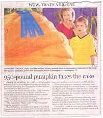 This article appeared in todays Manchester NH newspaper on the early weigh off in Vermont. Kevin Companion's pumpkin weighed in at 957lbs! Way to go Kevin. Don't ask me for any more 995s! Carts