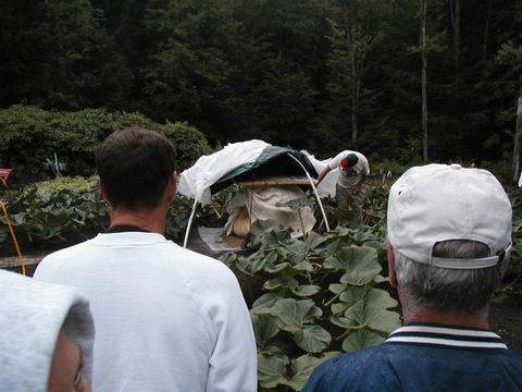 Jim Kunh showing the crowd one of his pumpkins, kind of. " This one tapes out at about 475#'s." SSSSSSuuuuureeeee it does.... I wish my pumpkin looked like that at 475!