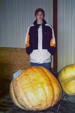 Yup, thats me with my 308lber, won that fair with second place being 262, 259.5, etc. Sorry if the picture turns out really small. Cross was 874 pugh x Selfed. The pumpkin is actually still turning orange.