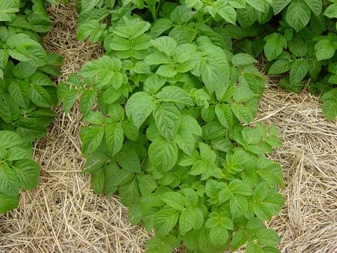The potatoes soil is cover with old wheat straw, which pass one year exposed to the rain and sun. Hopefully weeds and wheat seeds don't still having germination ability. Some studies show that, besides water retemption and soil cooling effect, the straw mulch help the potatoes to resist insect attacks.
