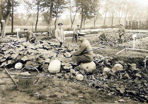 A very old pumpkin harvesting scene early last century. Must have been a very responsible job because they have to wear uniforms:-)