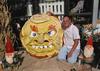 thre giant pumpkins weighting from 500 to 200 pounds this was carved by steve dahlke