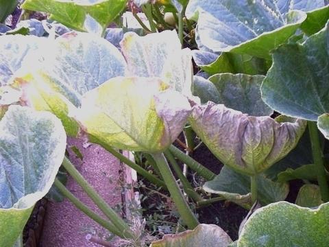 Please take a look at these ill pumpkin leaves. What might be the cause? Disease? Heat? What can be done to avoid the infection of further leaves? If it is a disease will it overwinter in the soil and occur again next year? If you have any ideas or suggestions please email me at: [email protected]
