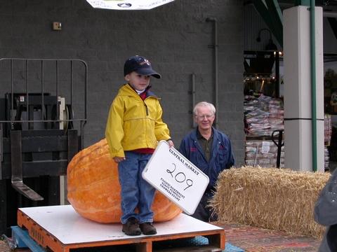 An enthusiastic second year grower tries to get a few extra pounds by jumping onto the scale with his pumpkin.  He'll have to settle for third place this year after winning the junior division last year.  But we expect more big pumpkins from this little guy for a long time to come.