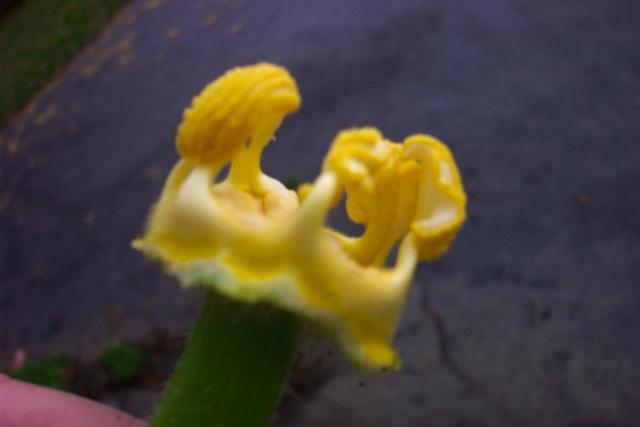I've heard that many growers of the 1016 Daletas have experienced a flat vine. My main vine showed no signs of flatness, but strangely, now some of my secondaries that are 12-15' long, are starting to ribbon. Today I found this mutant male flower, the petals were so large and puffed up I thought at first,it was a female. The stem for this flower is double flat. Seems to have 7 lobes. Does Steve live near a nuke? Mighty strange!