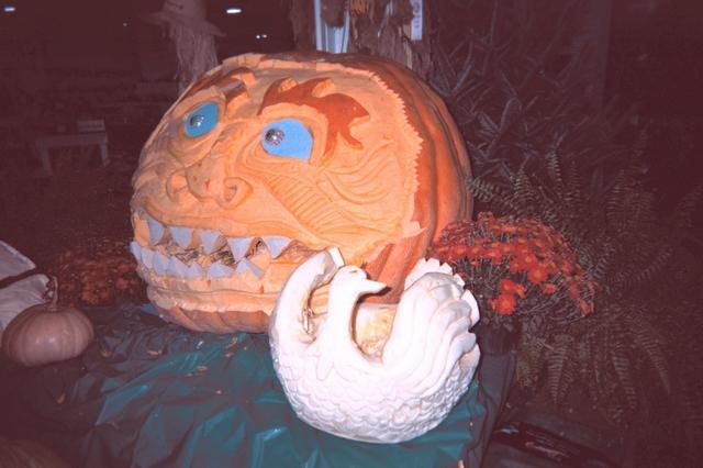 this was carve by steve dahlke at the indiana state fair in august the pumpkin wieghing 600 pounds in the backgrong and the swan around 100 pounds both carving took around two hours to carve