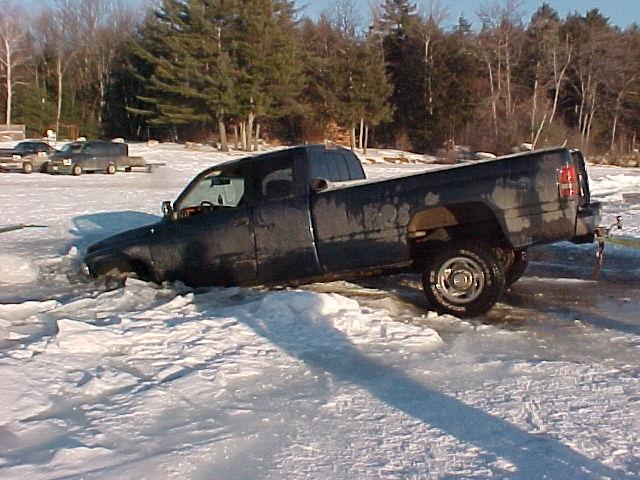 well after the ford tried to no avail,we called AAA they showed with a big ramp truck and got the truck out,but they only cover what breaks down on the road as most of you know this mishap cost over 200.00 cash,the moral of the story dont drive over pressure ridges while drinking alcohal in the middle of the night,i was fast asleep in the bobhouse when this occured, i had a good laugh in the morning though!