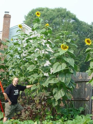 I only lost one of the smaller Bott's Strain plants to the storm we had tonight. This variety seems to do very well in storms. I think it's because of the narrow growth habit. The leaves aren't as large and don't create as much wind resistance. Notice how much more narrow the Bott's Strain plants are from the Ripley's Giant sunflowers in the front.