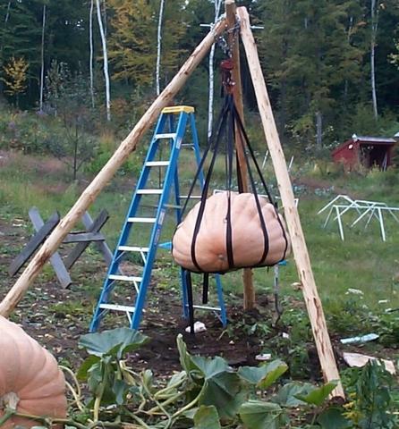 Tripod to lift pumpkin, shown lifting 550est. pumpkin. Unit is constructed out of 3 6-8" diameter hemlock trees about 14-16 feet long. At the top the trees are connected by a 24" piece of threaded rod run throug drilled holes. The holes in the side logs are drilled at and angle. To reinforce the rod the chain was run around the ends. The hoisting mechanism is a 1 ton level hoist connected to a strap lifter obtained from PandPseed.