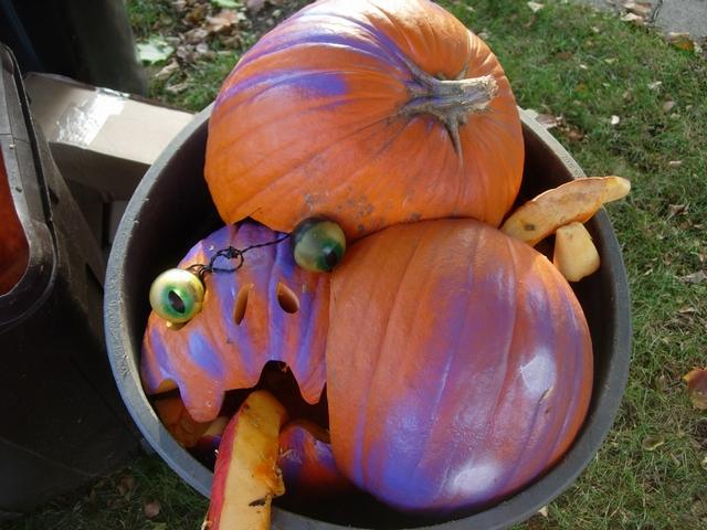 here is my carving in the garbage can after halloween event . snake looking out of the garbage can
