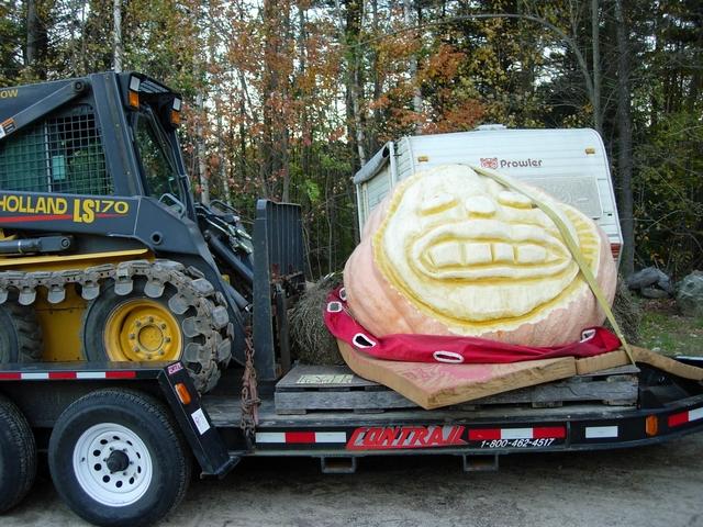 The final sculptured 1314.8 was then tranfered to a new location. I harnessed her down on the trailor and drove her to the Town Common, 8 miles East in my home town of Goffstown. There it was put on display for one week and enjoyed by all the Trick or Treaters and Parents on Halloween night.