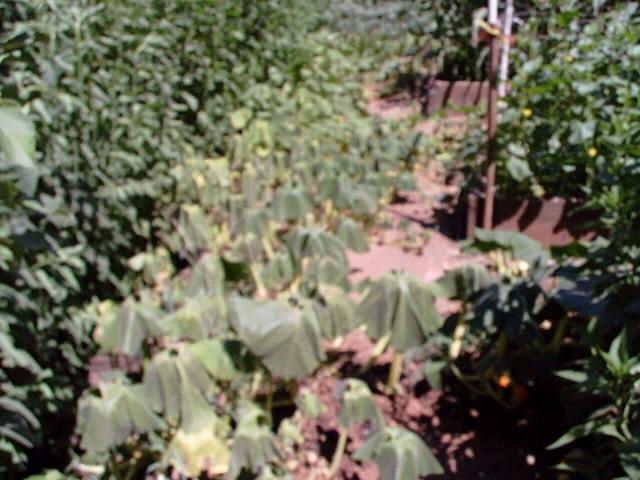 Here is the 200 Lawerce in foreground and the rest of the garden squash. Some of the giant green squash are in the background. Talk about wilting. This photo was taken at 3:00 when it was 108 degrees. Must be 130 degrees in the sun.