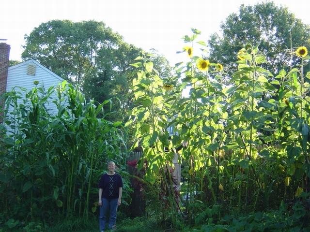 Picture of my wife (~5'4") standing next some of my various giant sunflowers. It's a mix of Botts, CravenXBott, Richard Hope Giant Singles. Tallest is a Richard Hope Giant Single. The Jala corn in the back row still has another month of growth left; so it will probably surpass the sunflowers in height.