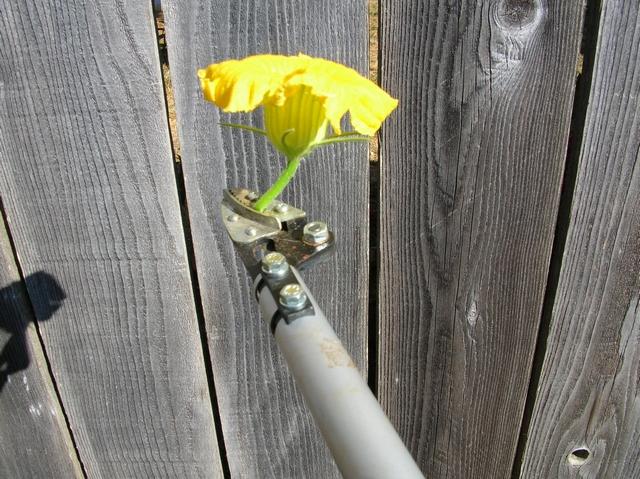 It is 5 feet long and will cut and hold the male blossoms. I have removed hundreds of males with very little bending over. Its easy on your back........and quick......and you compact the soil less by not walking as far in the patch.