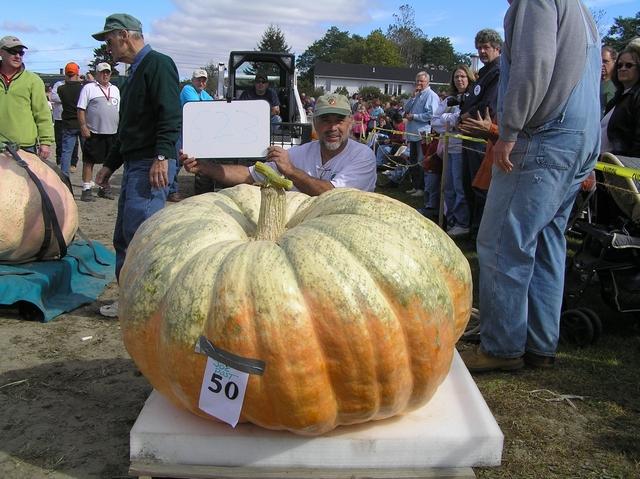 Joe Post from Massachusetts, displays is 623 pound upside down Giant Pumpkin at the Frerich Farm 2006 SNGPG GPC weigh-off.