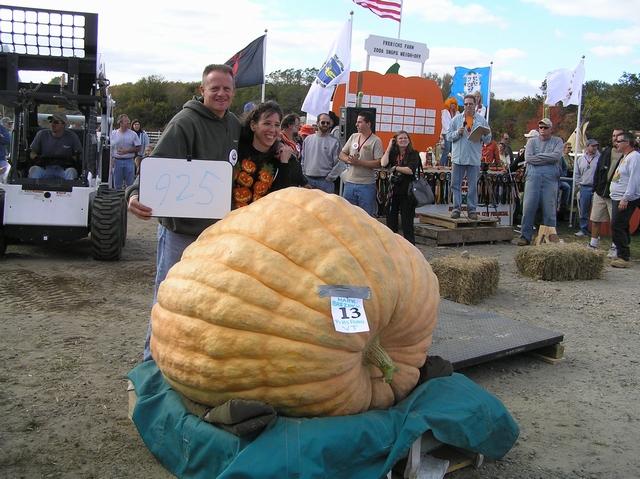 Mark Breznick and his wife share the spotlight with their 925 pound Atlantic Giant Pumpkin at the Frerich Farm 2006 SNGPG weigh-off. Great looking Pumpkin Mark! Glad you were able to harvest it out of the muddy garden after that Rain storm the night before.