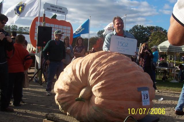 Ron Wallace kneels behind his world Record 1502 pound Atlantic Giant Pumpkin at the Frerich Farms 2006 SNGPG (GPC sanctioned) weigh-off. Ron earned 1st place everywhere on the planet with this behemoth pumpkin. Congrats Ron for breaking the 1500 pound barrier!