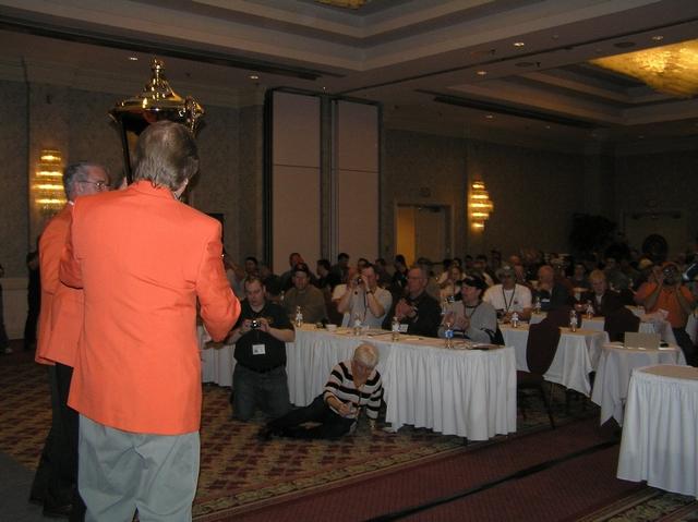 An attentive audience at the 2007 International Giant Vegetable Growers Convention in Niagara Falls, Ontario, applauds Ron and some other past Orange Jacket recipents at this years champ hoists the trophy.