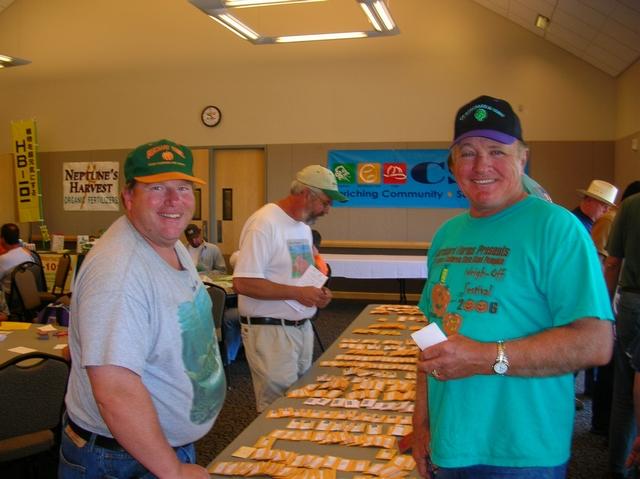 Scott Solomon and Tom Borchard are checking out the seed assortment on the raffle table. Thats Randy Warren in the background.