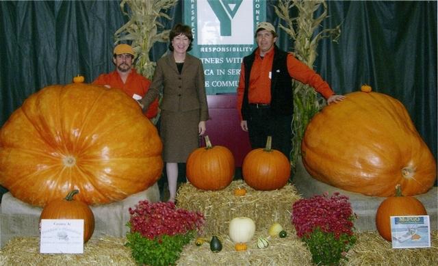 The folks who organized the Lincoln County Business Fair asked Buzz to build a podium display for Sen. Susan Collins to speak from during the fair keynote speach. They asked if we could flank the stage with our giant pumpkins. We spent the better part of the day setting up and this is a picture taken by one of Sen. Collins staff as Buzz and I pose for a photo op on stage.