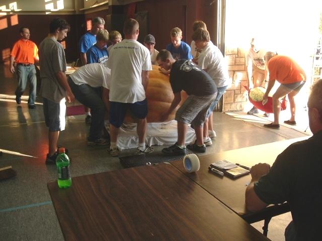 The Anamosa High School wrestling team supplies the muscle power for getting the pumpkins to the scales. This is the first pumpkin weighed, a little over 700#.