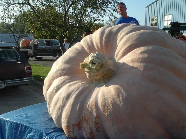 Coach Ron Timp surveys Don Young's huge pumpkin, wondering how they will ever get it on the scale.