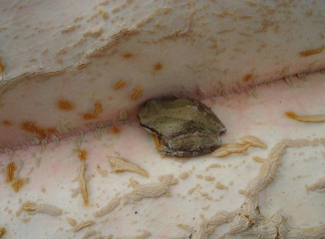 When the sheets were removed, Pete discovered a "good luck frog" living in one of the pumpkin ribs.
