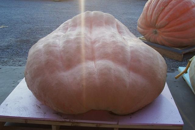 1556.5 Werner blossom end view, this pumpkin was so wide that Quinn had to make a special pallet for it, the pallet he made for it look to be about the size of 4 regular pallets put together. I bet I could lay down on this pumpkin with out my feet hanging off the end, anyone for a nap?,lol.