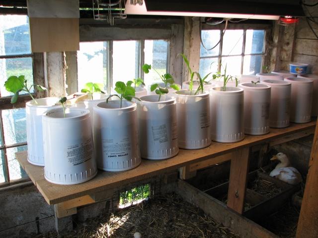 This year I started my pumpkins in the duck house. Just added some heat lamps, lights and a shelf. I used upside down ice-cream buckets as pots.