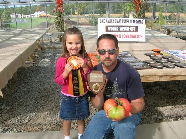My daughter Taylor and I posing with the 2008 Ohio State Record Tomato. The tomato was officially weighed in at the 2008 Ohio Valley Giant Pumpkin Growers annual weigh-off in Canfield OH. The tomato weighed in at 4.48 pounds.