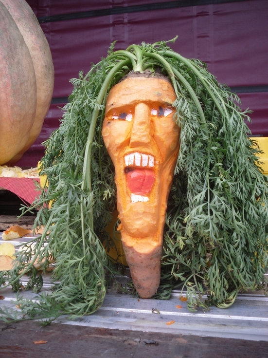 this isn't a pumpkin but thought i carve this giant carrot . this took 10 monutes to carve put a little paint on it bend the leaves down