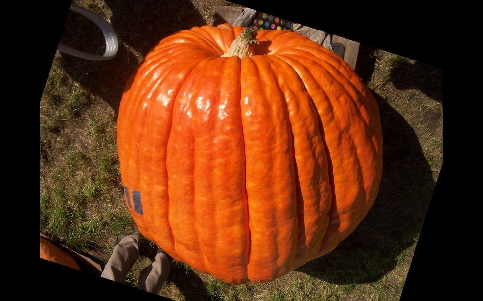 Found another picture on my camera files. Hard to find top view pictures of Pumpkins too. Being that so many are over 5ft wide, it gets hard to get the camera in the right position. I did not notice how good of a picture it was at first, until I rotated it, and added the black background. Being that it is an overhead view, it looks similar to the angle you would see the pumpkin from standing upright. I got the picture by stepping up onto the forklift to get up high enough to take it.