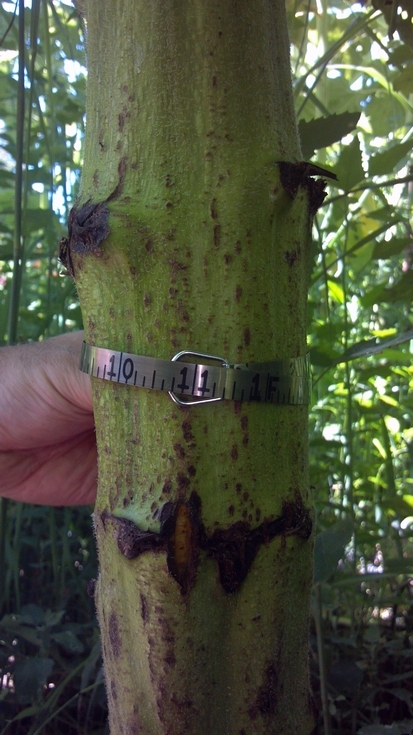 I was surprised that the stalk grew that much, since the plant has been flowering. It's almost 11 inches in circumference near the base. This is now a new personal best for me. If I'm really lucky, maybe I'll make 12 inches.